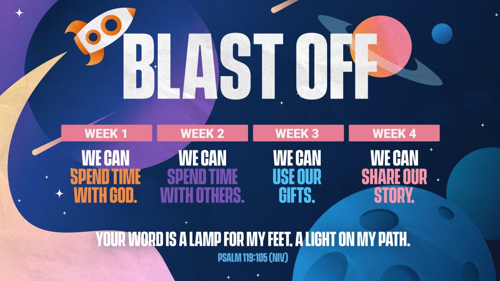If you’re a grown-up and you’ve been following Jesus for a while, you’ve probably figured out a few ways to grow spiritually. The kids you’re parenting or leading, on the other hand, aren’t grown-ups, so they might need a little help from you to figure out how, exactly, to grow spiritually. So what should spiritual growth look like for a kid? We like to think about it in terms of four spiritual habits. To help a kid grow spiritually, teach them to spend time with God, spend time with others, use their gifts, and share their story. So over the next four weeks in KidzWorld, your children will be learning about each of these habits and how to develop them in their own lives. Join us in reinforcing these habits with your kids and let’s blast off in 2025!